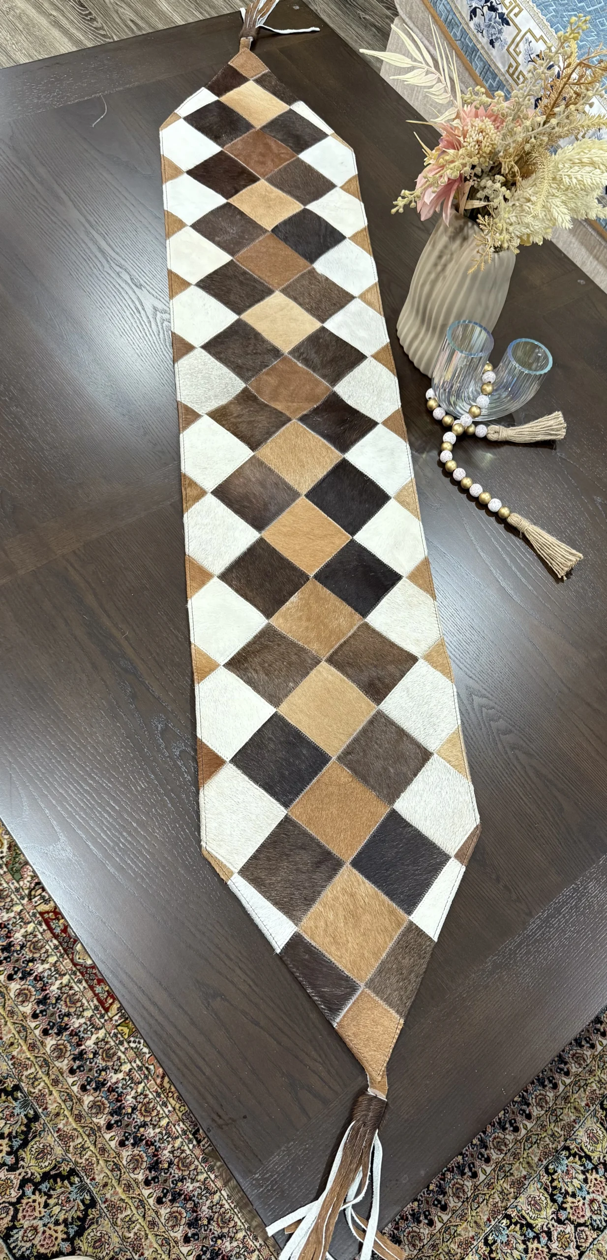 Add rustic sophistication to your home with our Etsy Natural Cowhide Patchwork Table Runner. Handcrafted using premium genuine cowhide and finished with durable synthetic leather backing, each piece of Natural Cowhide Patchwork Table Runner is unique, just like your space.